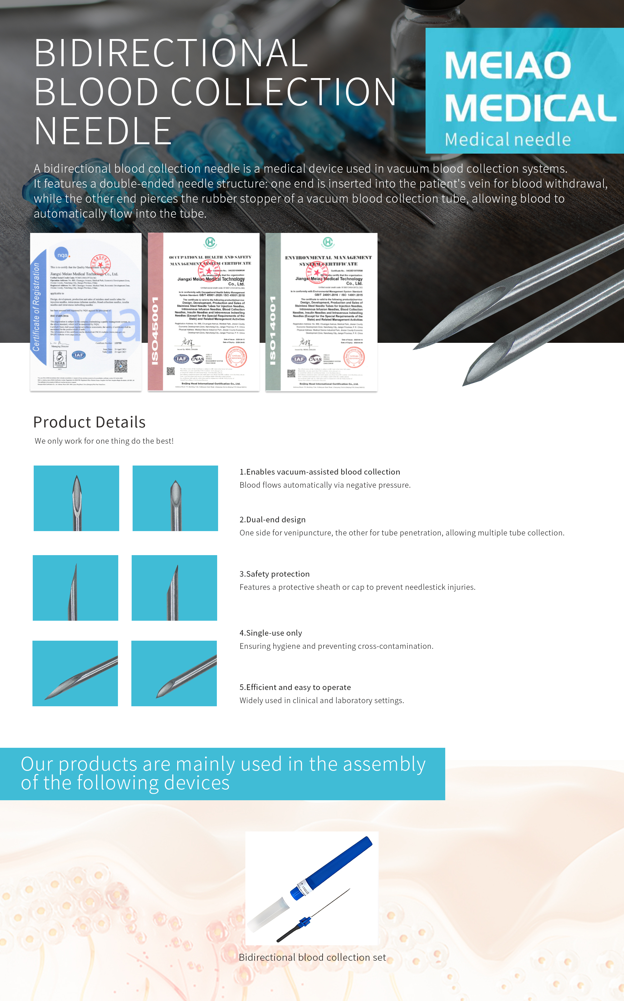 A bidirectional blood collection needle is a medical device used in vacuum blood collection systems.It features a double-ended needle structure: one end is inserted into the patient's vein for blood withdrawal,while the other end pierces the rubber stopper of a vacuum blood collection tube, allowing blood toautomatically flow into the tube.